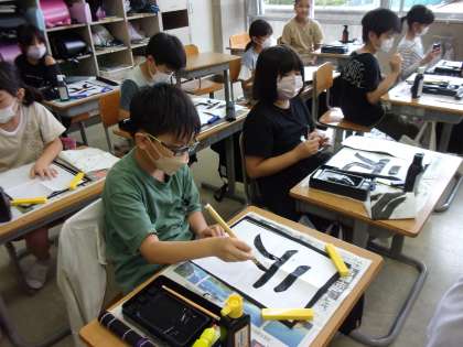 3年生 書写の時間 公開日 2022/09/28 更新日 2022/09/28 3年生 太く力強く、「元」という字を書きました。「筆の始まりの位置がいいね」「元気にまがりとはねができたね」とお互いの字を見合う子供たちでした。