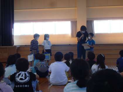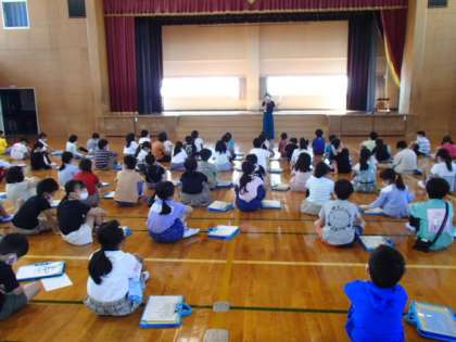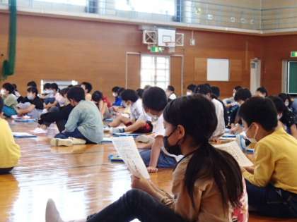 今日、学習発表会に向けて学年集会を行いました。学年目標「きらり★」に向かってがんばりたいことを考えたり、合唱の練習をしたりしました。「役割になりきってやりたいな」「大きな声が出せるように練習をしよう」など、一人一人が目当てを立て、やる気を高めました。