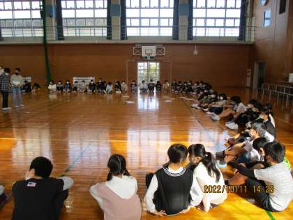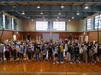明日の宿泊学習を前に、活動のリハーサルを行いました。最後に、全員で宿泊学習を成功させるぞという思いを写真におさめました。