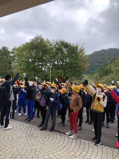 これから本日のメインの活動である来拝山登山です。みんなで気持ちを高めています。