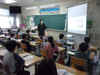 元気にABCの歌を歌いました。身の回りにあるアルファベットをたくさん見つけていました。ゲームやアニメ、車のメーカーなど、身の回りには英語があふれていることに気が付き、驚く子供たちでした。