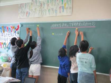 午後からの自分たちの発表を前に、各クラスで学習発表会に向けての思いを黒板に書きました。写真は1組と2組です。