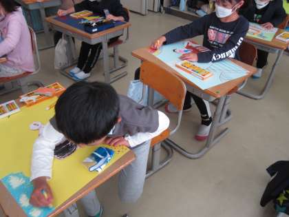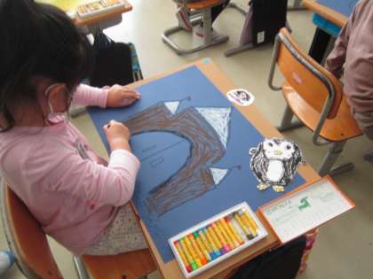 図画工作科の「のってみたいな いきたいな」の学習では、好きな動物に乗っていきたいところを描きました。子供たちの夢がつまった作品が完成しました。