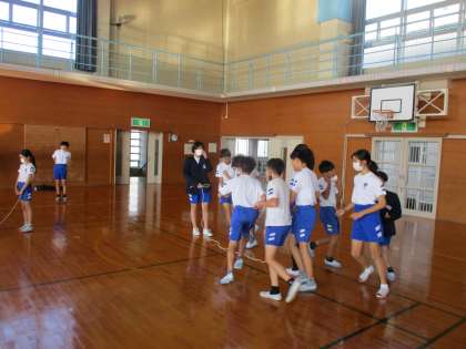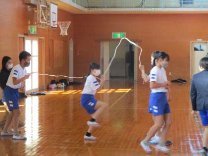 6年生は体育科の学習で8の字跳びをしています。上手に跳ぶグループのよさをみんなで見付けました。