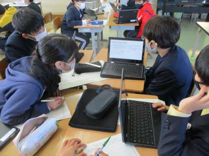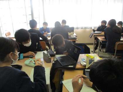 総合的な学習の時間に自分たちが調べた日本や世界のことについて発表しました。発表者は自信をもって発表し、聞いている友達はしっかりとメモをとっていました。この後、世界がハッピーになるために、自分たちはどんなことができるのか考えていきます。