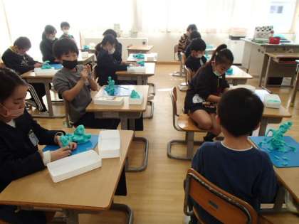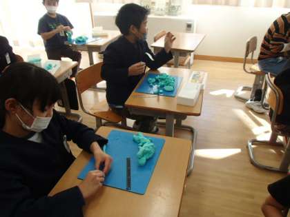 ねん土を使って、今まで自分ががんばったこと、楽しかったこと、嬉しかったこと等を思い出して形にしました。子供たちはねん土をひねり出したり、模様をつけたりしながらつくりました。