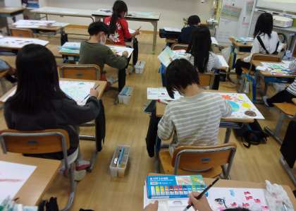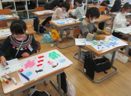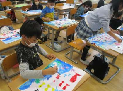 子供たちは、「スイミーと一緒に海の冒険」または「がまくんとかえるくんと一緒に宇宙旅行」の2つのテーマから1つを選び、「宝箱を見付けるんだよ」「宇宙人に会えたんだよ」などと、想像をふくらませて絵を描きました。先週クレヨンで描いた絵を今週は水彩絵の具で仕上げました。描きたいものに合わせて「スーッ」「ぐっ」「てんてんてん・・・」など、筆の運びを工夫して描くことができました。