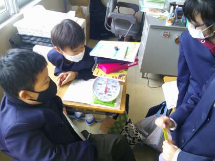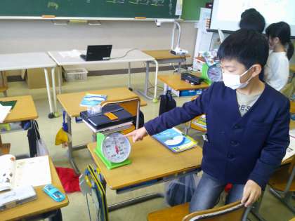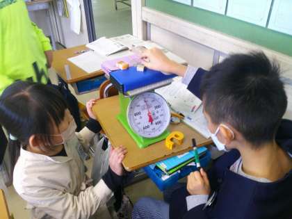 算数科「重さのたんいとはかり方」の学習で身の回りの物を組み合わせて1kgをはかりました。