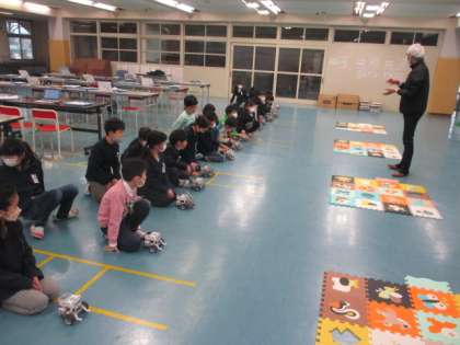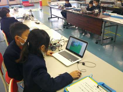 プログラミング学習を行いました。「今日は、プログラムを自分たちで作ってロボットを動かすよ」と投げかけると、「やってみたい!」と大興奮の子供たちでした。プログラミングを教えてくださる先生の話をよく聞きながらペアで協力して行うことができました。