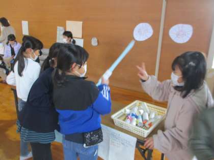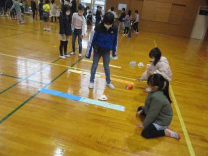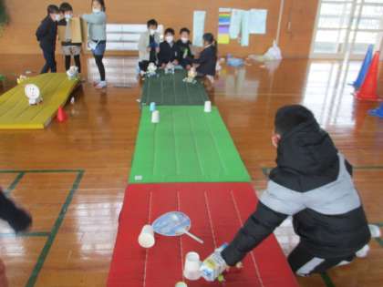 生活科の学習でつくったおもっちゃで遊びました。おもちゃの遊び場を工夫してつくり、お客さんを遊ばせてあげたり、自分たち自身も友達がつくったおもちゃで遊んだりして楽しみました。