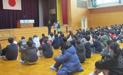終業式では、2学期に自分たちが頑張ったことを振り返りながら校長のお話を聴きました。代表者の発表では、総合的な学習の時間に取り組んだことを発表し、これからも節電や節水に取り組んでいこうと呼びかけました。