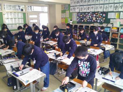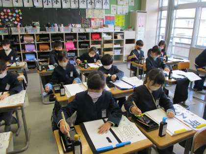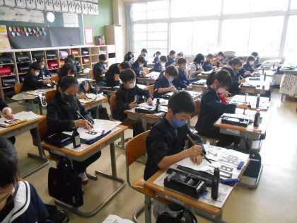 子供たちは、冬休みの練習の成果を精一杯発揮しようと、「とめ」「はね」「はらい」や字のバランスに気を付けて取り組みました。