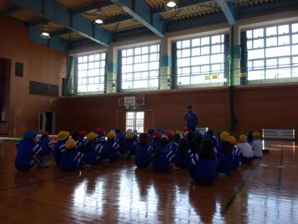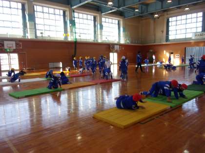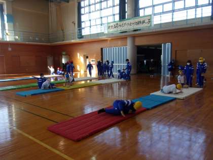 体育の学習では、マット運動をしました。すばやくマットの準備や片付けをしたり、脱いだうち履きを壁に揃えて置いたりしました。側転など自分で決めた技に挑戦する子供たちです。