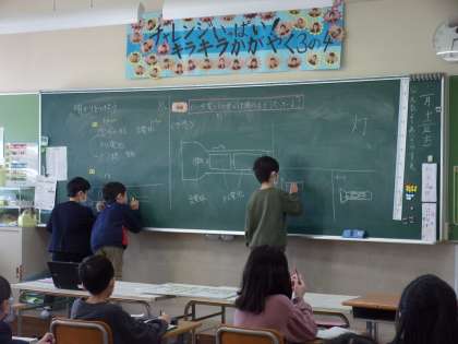 理科の学習では、懐中電灯の中がどうなっているか考えました。電池のしくみを学んでいます。