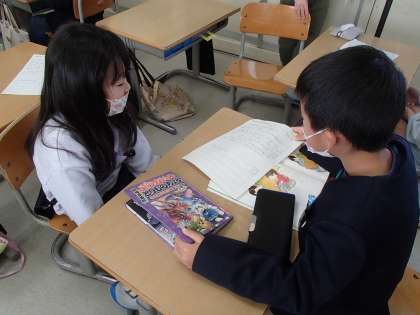 国語科「ききたいな、ともだちのはなし」の学習で、好きな本について紹介したり、質問し合ったりしました。「好きな本は、人それぞれだな」「同じ本を選んでいても好きな理由は違うんだな」など、様々な気付きがあったようです。これを機会に読書の幅が広がるとよいですね。
