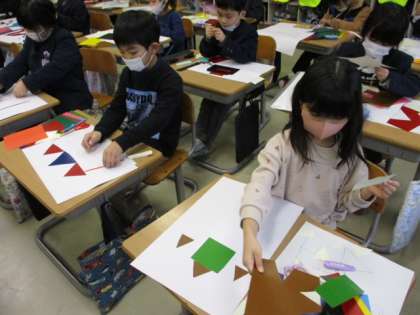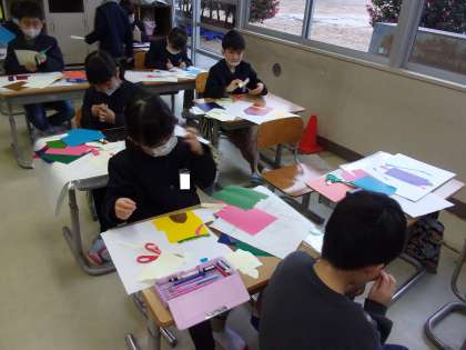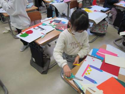 図画工作科では、子供たちがあったらいいなと思う城をカラータック版画で作成しています。今日はシールをはさみで切ったり、手でちぎったりして厚紙に貼り、思い思いの城を描きました。