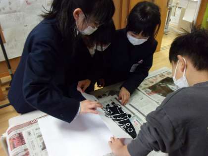 初めてのローラー版画をしました。今回のテーマは「生き物」です。自分が描いた生き物をどこに配置しようか考えたり、友達と協力したりしながら版画を刷ることができました。1つ1つの初めての作業を楽しみながらつくっています。