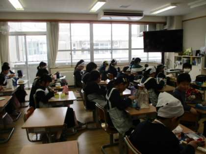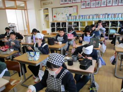今日はスキー学習の予定でしたが、天候の影響により2月8日に延期にしました。今日は、お家の方が用意してくださった弁当をみんなで食べました。
