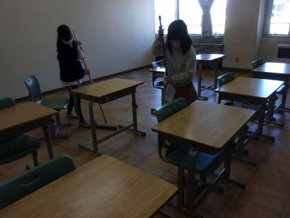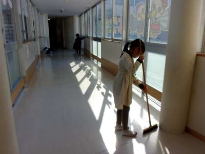 スキー学習へ行っている6年生や学級閉鎖の学級が担当している掃除場所を見て、誰も掃除していないことに気が付き、3年生の子供たちが進んで掃除をしました。すみずみまで綺麗にほうきで掃きました。