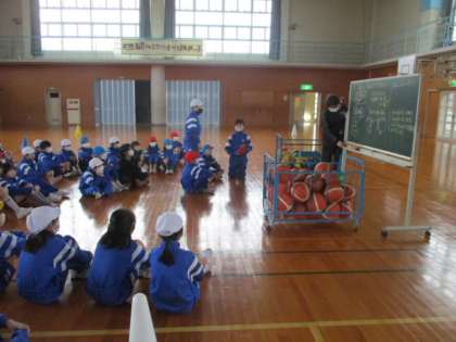 バスケットボールの学習を始めました。パス回しの練習やボールに慣れ親しむ活動を行いました。