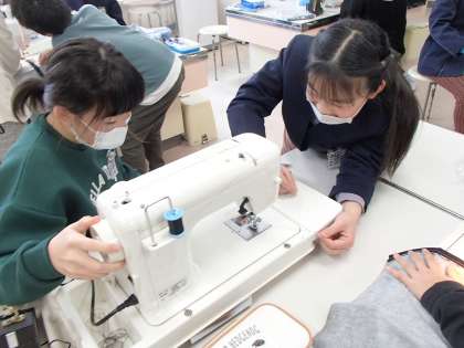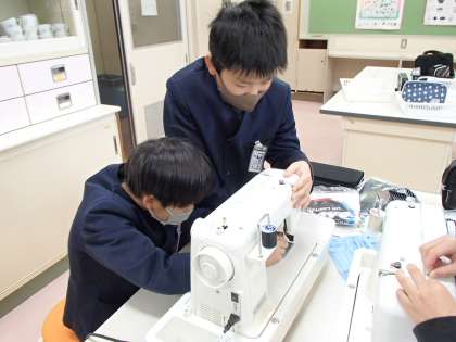 家庭科の学習ではミシンを使い始めました。正しい使い方を確認しながら学習を進めています。
