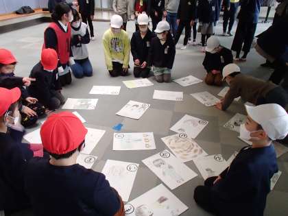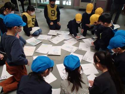 2年3組が6年3組のお兄さんお姉さんと一緒にカルタあそびを楽しみました。色団ごとに協力して真剣に取り組み、絵札を取った友達を称え合う姿が見られました。