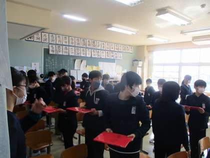 今週末から、体育館で学年が揃って卒業式の全体練習を始めるのを前に、各教室で授与の動きについて確認をしたり、練習をしたりしました。