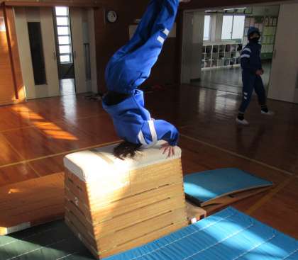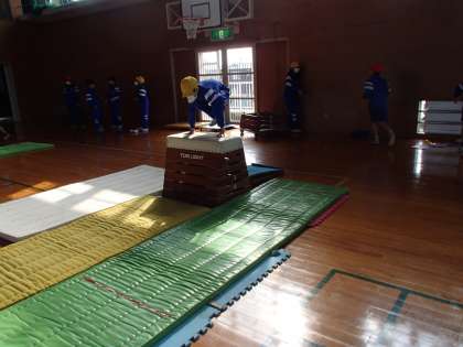体育科で、跳び箱をしています。開脚跳びや台上前転、首はね跳びなど、様々な種類の跳び方を自分で選択して練習しています。