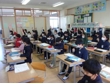 初めは、緊張して固くなっている様子も見られましたが、次第に打ち解け、元気よく発表したり近くの席になった友達と交流したりすることができました。