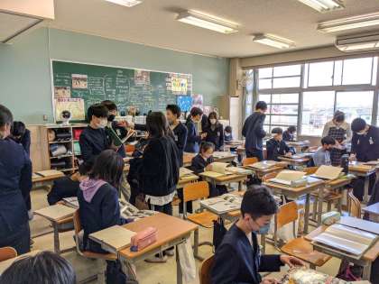 今日、子供たちに卒業アルバムを配りました。自分たちの写真や文集を見て、うれしそうな姿や少し恥ずかしそうな表情も見られました。その後は、友達とメッセージ交換をしました。