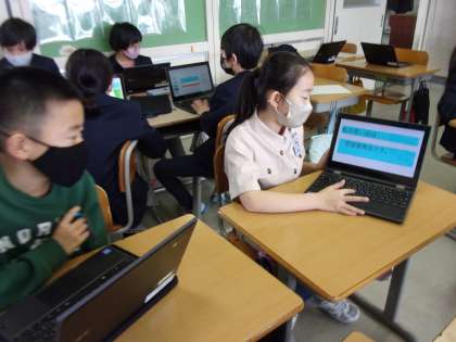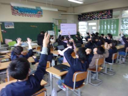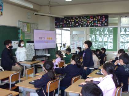 「なわとびのできる技が増えたこと」「跳び箱の段が増えたこと」など自分の成長を見つめる子もいれば、「学習発表会」や「校外学習」などの思い出を振り返る子もいました。「授業」で担任の先生やクラスの友達の良さを発表する子もいました。クイズやアニメーションを取り入れて、聞く人も楽しく参加できるよう工夫をこらしていました。