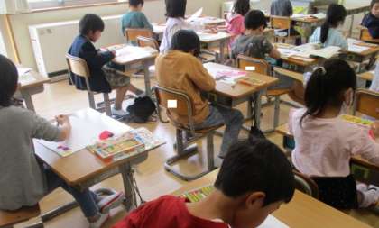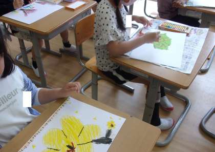 グラウンドや観察池の周りで春を見付け、見付けた春から表したいことを考えて描きました。
