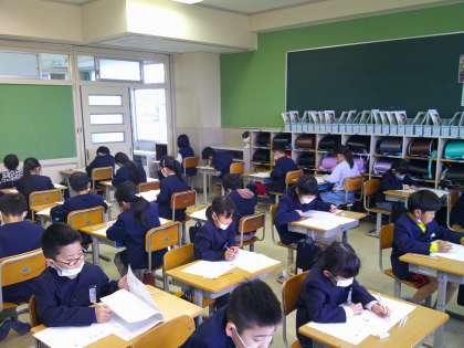 3年生は、初めて学力調査を行いました。1日日は国語科で、問題と解答に分かれた用紙に少し緊張した様子でしたが、全員が時間いっぱい最後まで取り組みました。明日は、算数科の調査です。