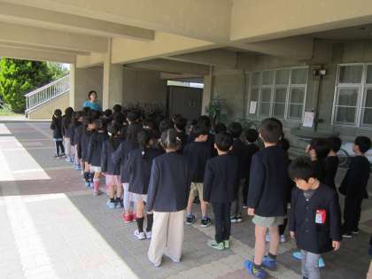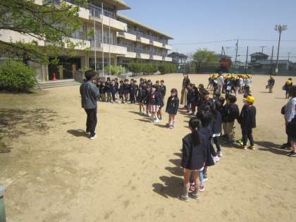 生活科の学習では、グラウンドの使い方について学びました。危ない場所や入ってはいけない場所をみんなで確認しながら、グラウンドを一周しました。