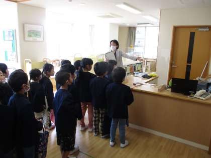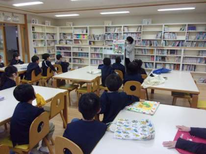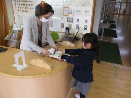 初めての図書室に行きました。読み聞かせをしていただいたり、利用の仕方を教えていただいたりしました。その後、初めて本を借りました。その際には、本の向きに気を付けながら、学校司書の先生に「お願いします」と言って借りていました。
