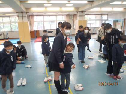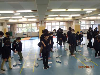 17日から始まった「入学お祝い交流」も今日で終わりです。6年1組と1年1組、6年2組と1年2組、6年3組と1年3組、6年4組と1年4組で交流しました。1年生と仲良くなるためにどんな交流にするか、各クラスで話し合いました。新聞じゃんけん、猛獣狩りに行こうゲーム、じゃんけん列車、だるまさん転んだ、学校クイズ爆弾ゲームなど、いろいろな遊びをしました。活動では、自然と6年生も1年生も笑顔でいっぱいになりました。