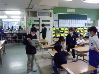 1年生の朝の準備もスムーズになり、6年生は読み聞かせをしたり、自由帳を書く様子を見たりするなど、有意義な時を過ごしています。読み聞かせでは、じっくりと聞き入る1年生が増えています。