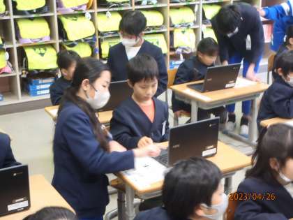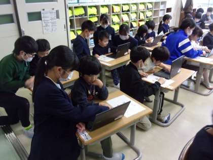 タブレットの操作ができるようにうなった1年生は、早速、お絵かきアプリなどを体験していました。6年生は、よきアドバイザーとなり、後片付けも一緒に行うなど、互いに輝き合う時間となりました。6年生は、振り返りで「1年生さんがうまく操作していてすごかった」など、1年生の成長を喜んでいました。