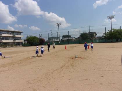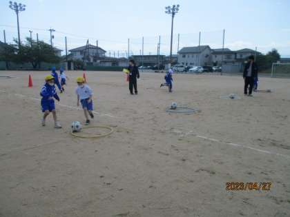 運動会で行う大玉転がしの練習を行いました。大玉で取り組む前に、ペアで協力することを大切にするために、フラフープやサッカーボールを使って、速さを合わせて走る練習をしました。ペアで息を合わせて活動することで、どんどん上手になってきています。