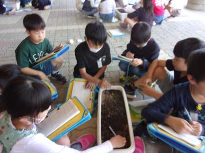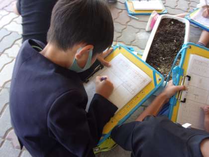 午後から、子供たちが植えたホウセンカの様子を観察しました。種の状態から葉に成長している様子を見て、歓声があがりました。大きさや気付いたことなどをノートに記録しました。