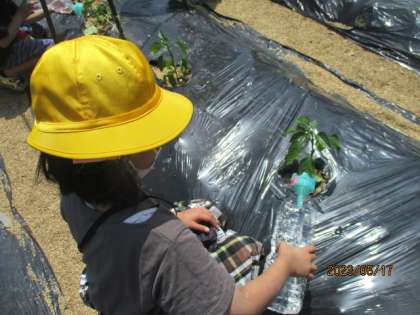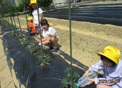 子供たちは、「大きくなった」「花が咲いた」「もうミニトマトの匂いがする」など、いろいろなことに気付きながら、丁寧に水をあげています。