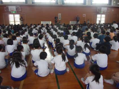 全校が集まる今年度初めての避難訓練を行いました。地震発生の設定で体育館に避難しました。担当教員から、「毎回の訓練を真剣に行いましょう」という話を聞き、子供たちは気を引き締めて訓練に参加しようと気持ちを高めました。