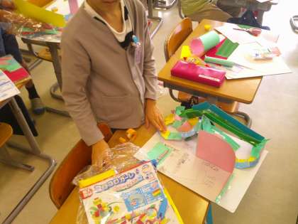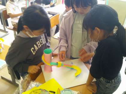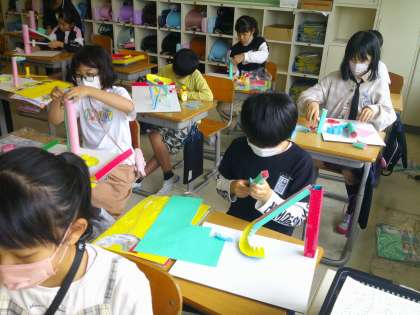 図画工作科の「コロコロガーレ」の学習では、ビー玉を転がして遊ぶ作品を作っています。子供たちは、いろいろな材料に触れながら、工夫して作品を作っています。