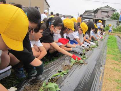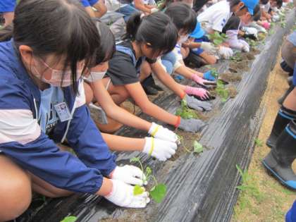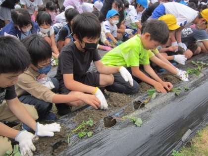 地域のボランティアの方に教えてもらいながら、学校農園にさつまいもの苗を植えました。子供たちは、「大きく育ってほしいな」「今から収穫が楽しみだね」と希望に胸を膨らませていました。