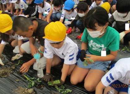 さつまいもの苗を植えました。5年生とペアになり、お互いに声をかけ合いながら、しっかりと土の中に植えて、水をかけました。秋の収穫が楽しみです。