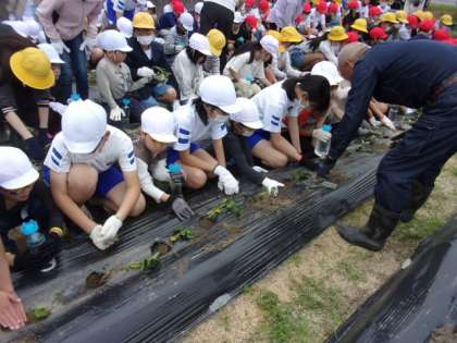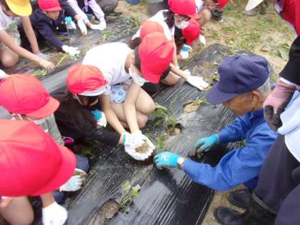 1年生と一緒に、サツマイモの苗植えをしました。地域のボランティアの方に植え方を教わりました。秋の収穫が楽しみです。