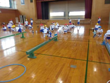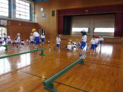 体育科では、平均台を使って運動をしています。今日は、平均台の上で動物歩きや大股歩き、横歩きをしました。バランスを保ちながら、歩くことができました。