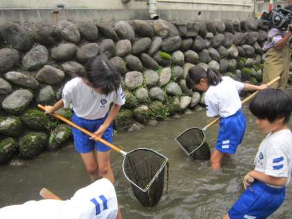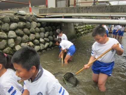 総合的な学習の時間では、魚津水族館の学芸員の方に来ていただき、生物採集の仕方を教わったあと、学校近くの田島川に入り、生き物探しをしました。