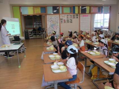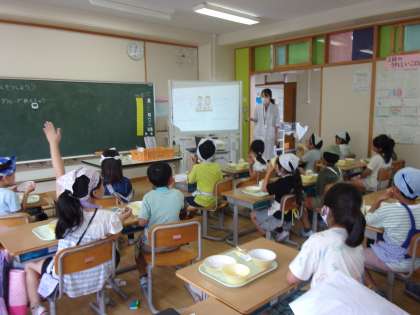 朝の読書タイムに、栄養教諭に「しらす丼」というお話の読み聞かせをしていただきました。給食時間には、「しらす丼」の話と関連させて、栄養教諭の話を聞きました。自分たちが動物や植物の命をいただいて生きていることを知り、感謝して食べようという意識をもつことができました。
