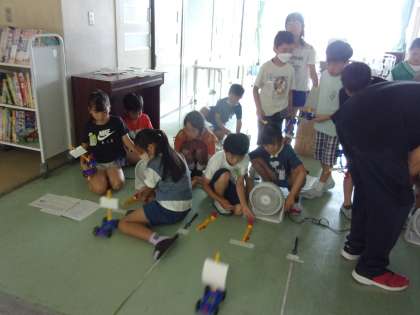 理科の学習で、教材の車を遠くに進めさせるには、風力や風を受けるものの大きさがどの状態であればよいのか考えました。送風機の向きや風を受ける厚紙の場所等も考えながら実験しました。